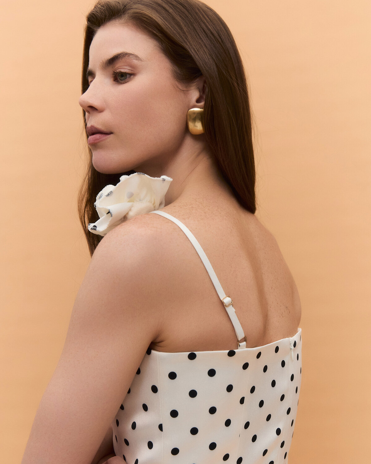 Невесомый силуэт, классический горох и изящный цветок на плече создают образ, наполненный спокойной элегантностью.